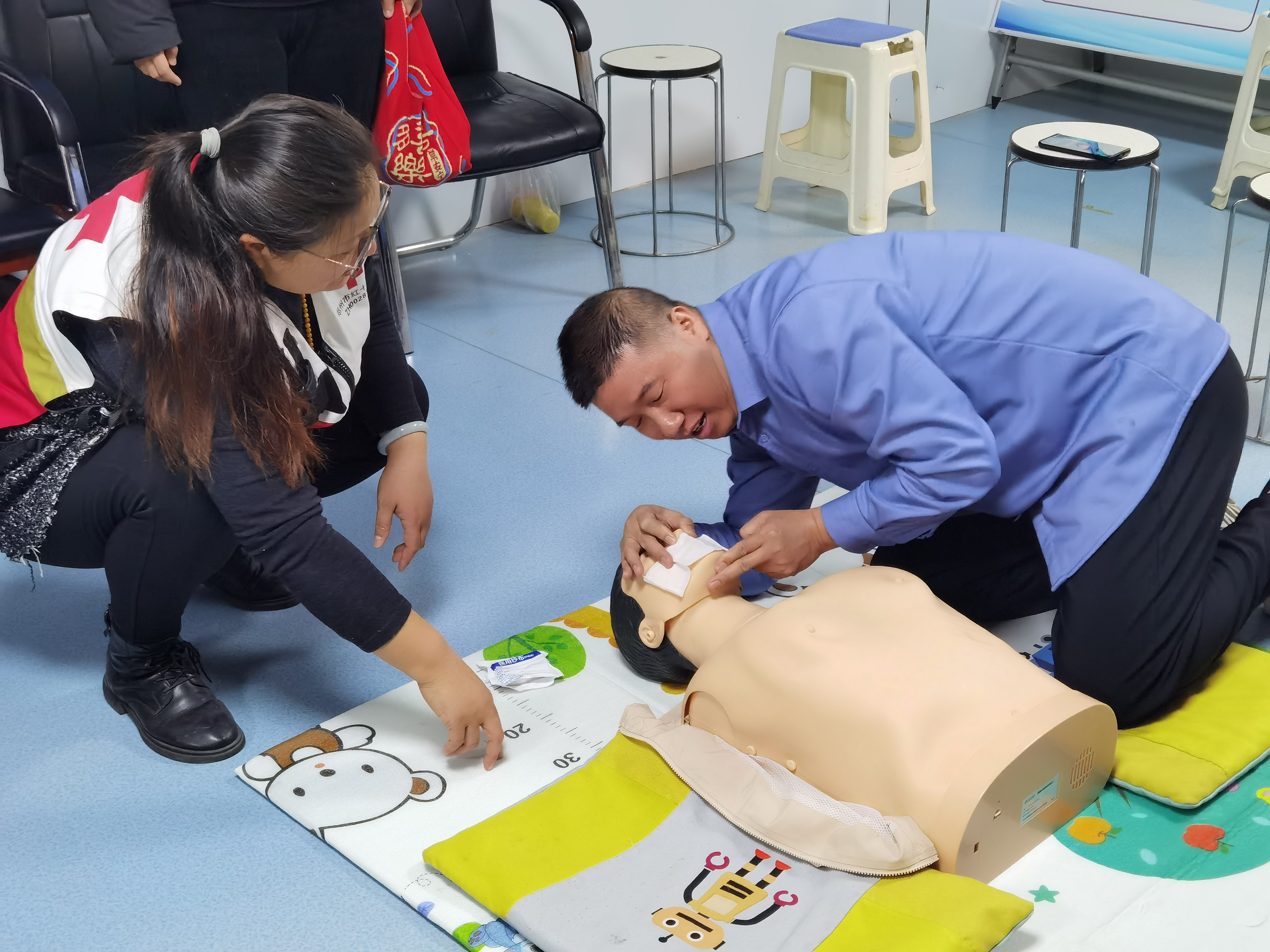现场演示环节,培训师亲自示范心肺复苏和海姆立克急救法的标准动作,工作人员认真观察,积极提问。在实际操作阶段,大家分组练习,培训师逐一指导,确保每个人都能掌握关键操作要点。