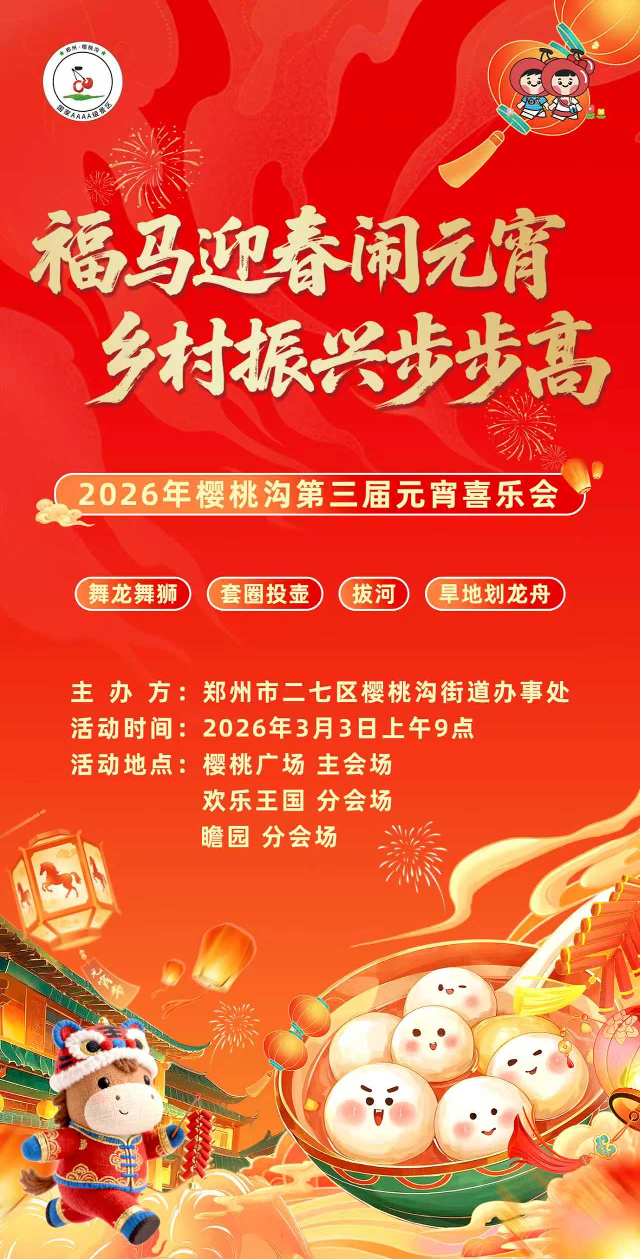 福马迎春闹元宵,乡村振兴步步高。2026年3月3日(农历正月十五)上午8:30,郑州樱桃沟景区樱桃广场将举办一场热闹非凡的闹元宵喜乐会。