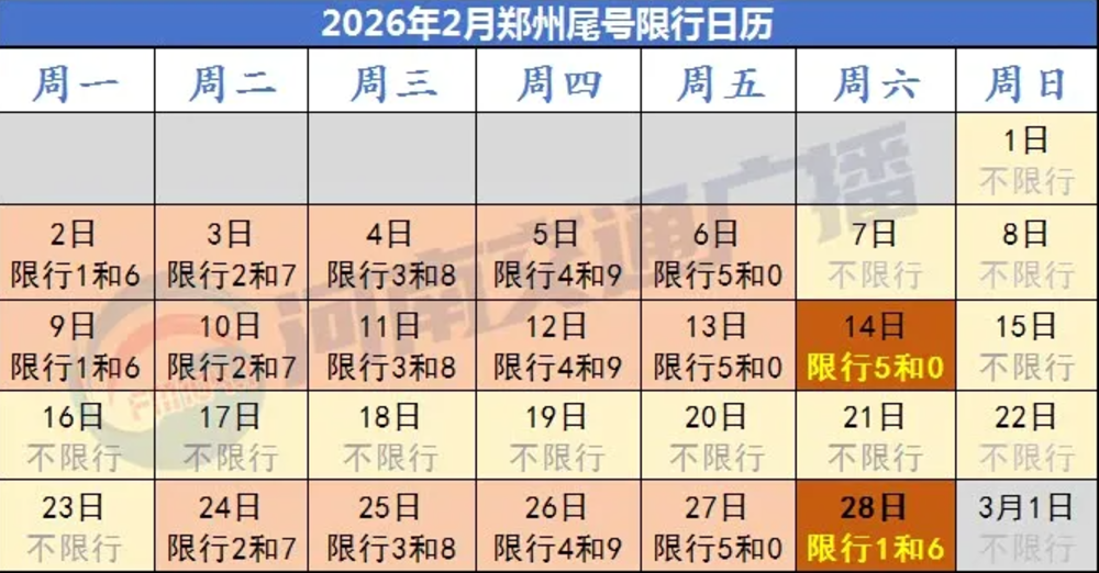 郑州2月限行尾号日历来啦!记者从郑州交警方面了解到,本月春节假期、调休期间,郑州限号有调整,一起来看!